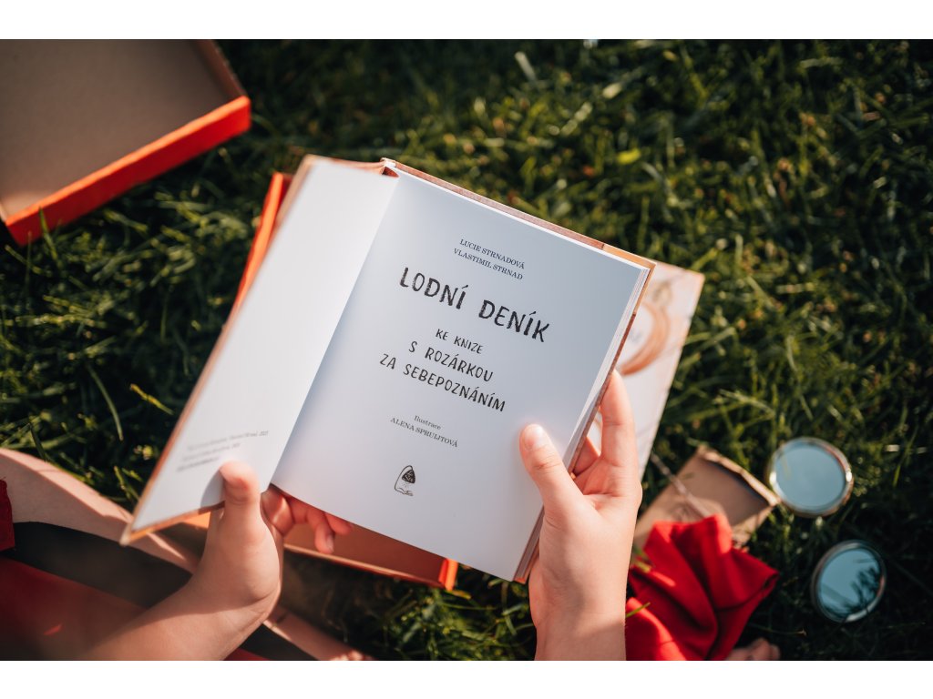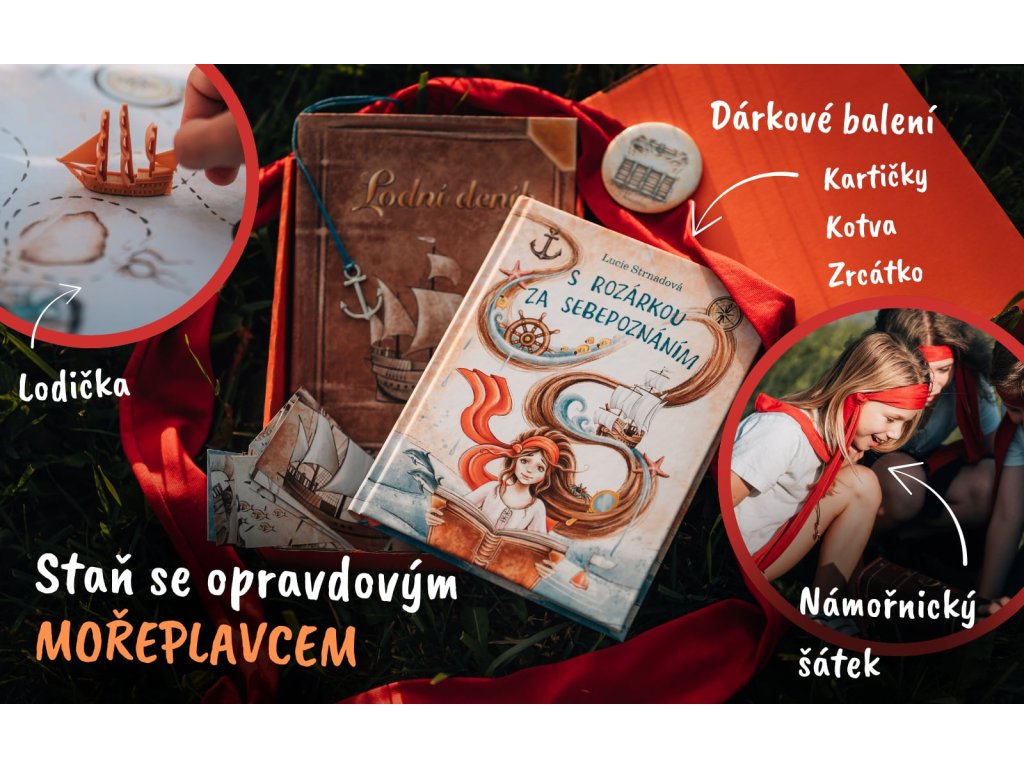 Obsah balíčku: kniha S Rozárkou za sebepoznáním, kniha Lodní deník, červený mořeplavecký šátek, kotvička na krk, lodička, zrcátko, karty sebepoznání/mapa (2v1), dárkové balení.