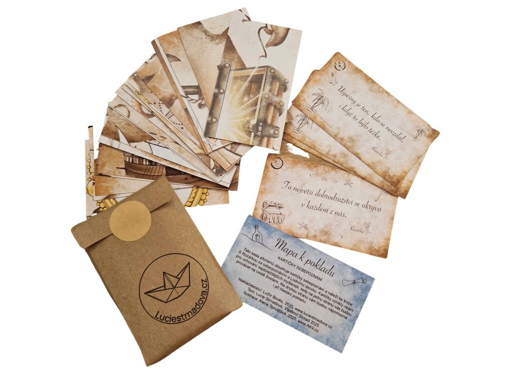 - Karty sebepoznání/mapa (2v1): Sbírejte motivační kartičky v průběhu vašeho čtení a vyplňování úkolů. Ke každé kapitole náleží dvě kartičky a pomohou vám nejen v nalezení pokladu, ale nejdůležitější myšlenky z knihy vás mohou provázet celým životem.
